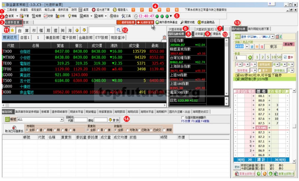 1.從左邊報價,點選後右邊商品會自動帶入,例如台指近就會出現TX00(台指近)