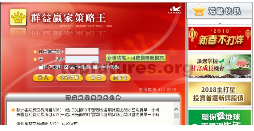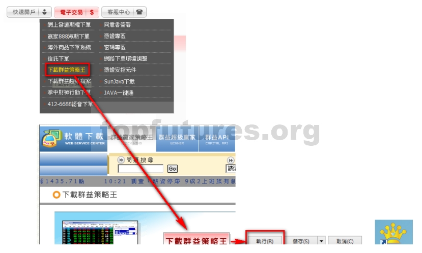 1.群益金融網(http://www.capital.com.tw)右上方電子交易=>下載群益策略王。