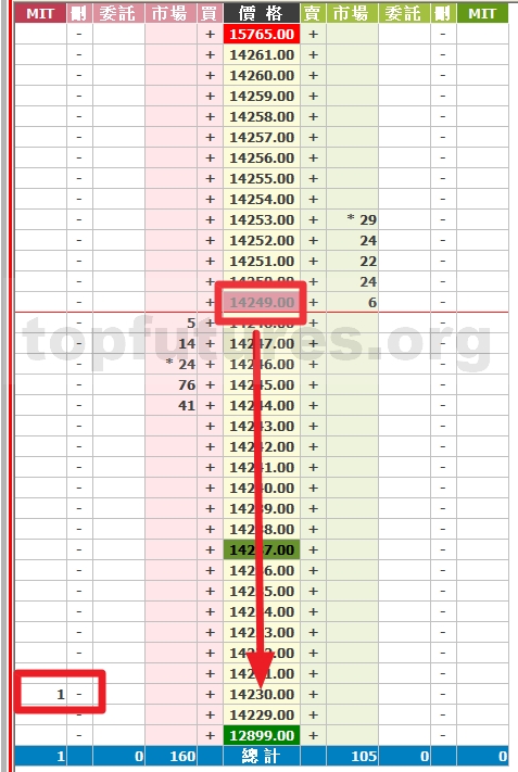 結果 : 當成交價觸及14230,立刻用市價買進停利