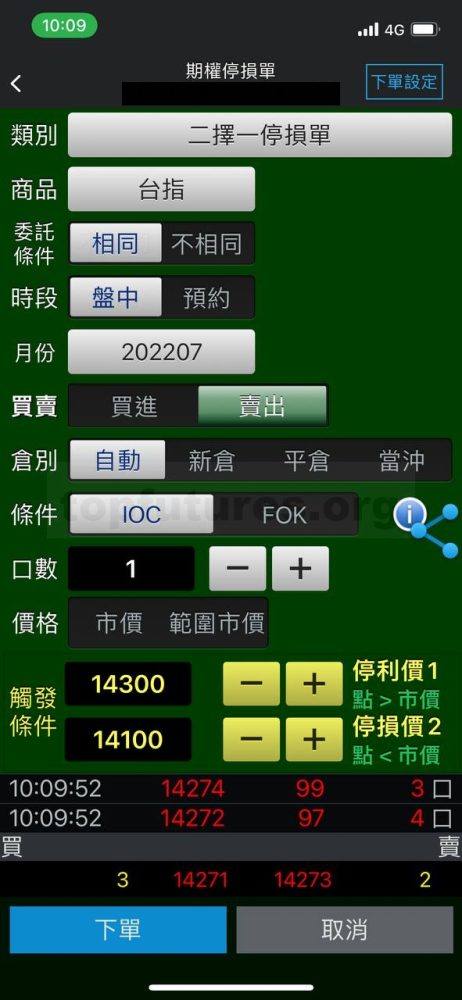3. 設定高於市價之觸發條件。 例如 : 市價高於14300。