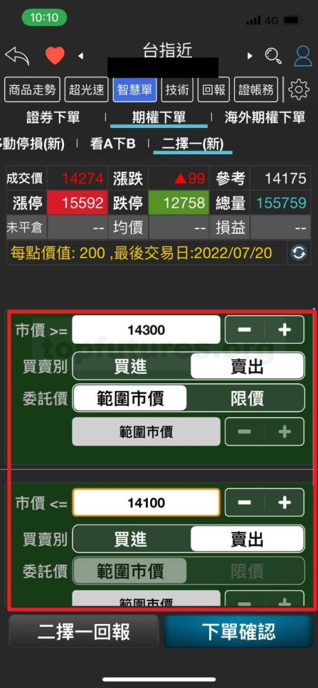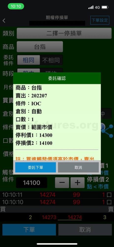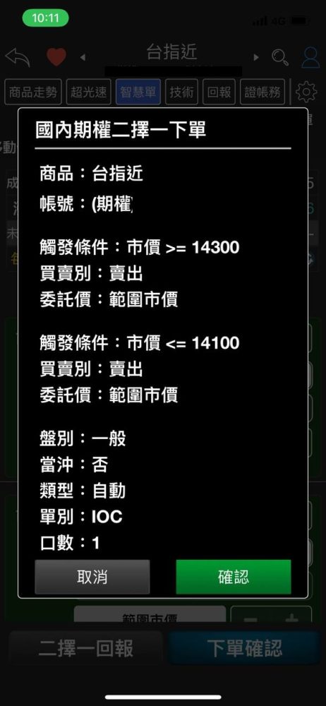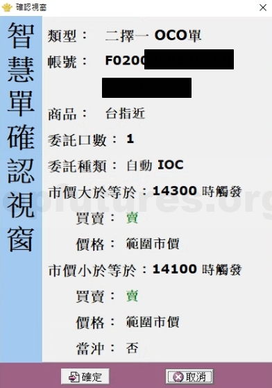 5. 確認設定項目是否正確,點選「確認」。例如: 持有多單,設定14300停利,14100停損