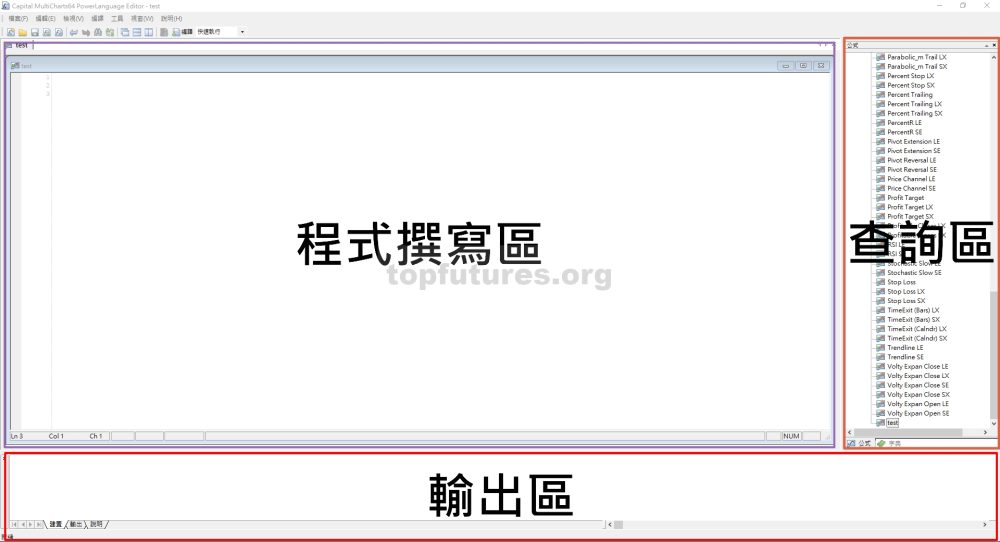 當您打開 PowerLanguage Editor (PLE) 時,會看到三個主要的區塊。首先是程式撰寫區,這是您編寫 Powerlanguage 程式碼的地方。在這個區域中,您可以使用 Powerlanguage 語言編寫複雜的交易策略。 其次是檔案資料查詢區,這個區域可讓您查詢內建的指標、函式、和訊號。此外,您可以使用字典來查詢關鍵字參考。原廠也提供關鍵字參考供您參考,您可以點此下載。 最後是輸出區,當您運行 Powerlanguage 程式碼時,此區域會顯示輸出結果,例如錯誤訊息、訊息日誌等等。這個區域可以讓您了解您的代碼的執行情況,並進行調試。